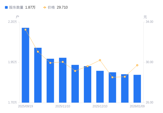 日期A股户数(户)流通A股户均持股数(股)户均持股市值(万元)2026-01-09187236377.9318.952025-12-31187596365.6918.192025-12-19188796325.2218.032025-12-10189736293.8919.012025-11-28192596200.4218.362025-11-20193416174.1317.992025-11-10197796037.4118.142025-10-20197226054.8618.132025-09-30204035852.7618.172025-09-19216395518.4618.34